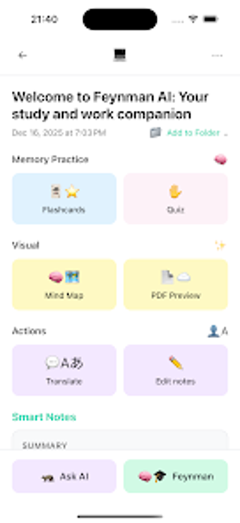 Feynman Mind, Feynman Tekniği'nden ilham alan, AI destekli bir öğrenme ve not alma uygulamasıdır. Bu uygulama, karmaşık konuları basit bir dille açıklayarak, kullanıcıların bilgiyi derinlemesine anlamalarına yardımcı olur. Uygulama, öğrencilerden profesyonellere kadar geniş bir kitleye hitap eder ve öğrenim sürecini içerikten kavramaya kadar destekler. Kullanıcılar, ses kaydı, video yükleme veya PDF belgeleri gibi çeşitli içerikleri notlara dönüştürebilir ve bu notları kolayca organize edebilirler.